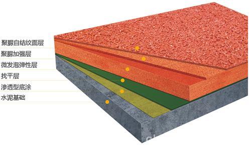 全塑型塑膠跑道分兩層結(jié)構(gòu),底層以再生膠粒與單組份膠水按比例混合攪拌后經(jīng)由專業(yè)施工隊(duì)鋪設(shè)壓平,面層由EPDM橡膠顆粒與單組份膠水混合而成,厚度為13mm。